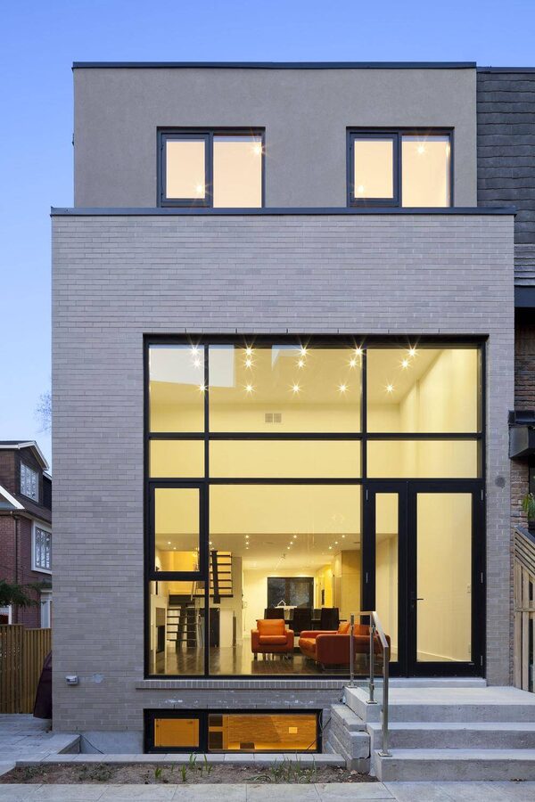 For the exterior, an eye-catching block was installed on the northeast corner of the house, which is made from SwissPearl siding, an ultra-light cement composite. The original brick motif was updated with a more modern brick with a smoother surface, a choice meant to blend the new modern exterior with the brick that dominated the rest of the row houses.Tom Arban