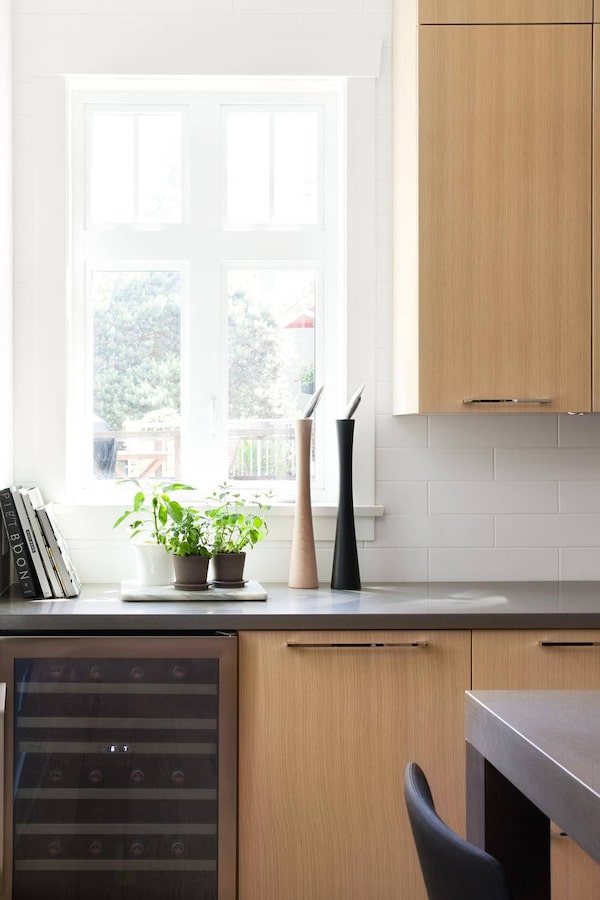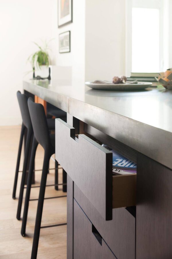 The average countertop overhangs three-quarter inches. But to make the most of a tight space, the overhang was eliminated and replaced by a three inch chunky countertop that was flush with the cabinet doors. Standard hardware was also ditched in favour of notched out handles.Barry Calhoun