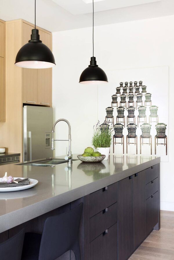With a high ceiling, it’s nice to add a ceiling drop that breaks up the white plane and adds visual interest. Here we designed a simple drywall box with the same dimensions of the island, and recessed a centre section that holds the canopies for black barn-style pendant lights.Barry Calhoun