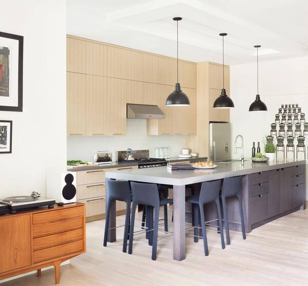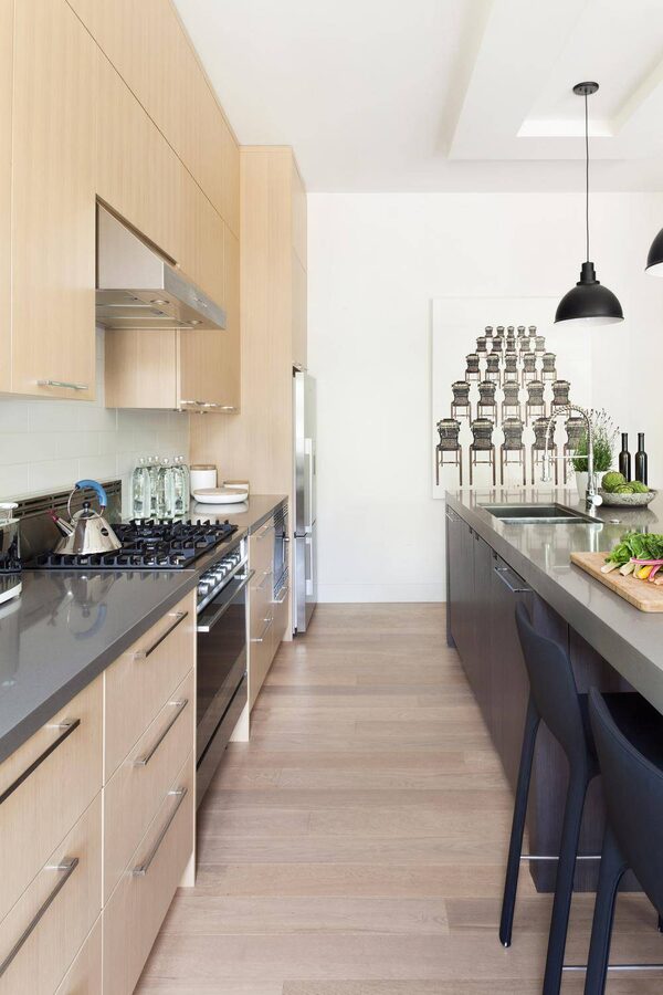 Kitchen in the home of Barry Calhoun and Teresa Comeau. Design by Kelly Deck Design. A galley-style kitchen running along the east wall of the space, with a 12-foot island down the centre that incorporates a dining zone for six.Photos by Barry Calhoun