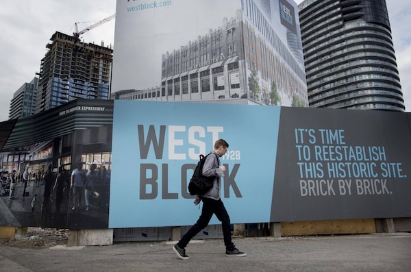 A pedestrian walks past a sign for West Block 1928 Condos in Toronto on May 27, 2017.Brent Lewin/Bloomberg