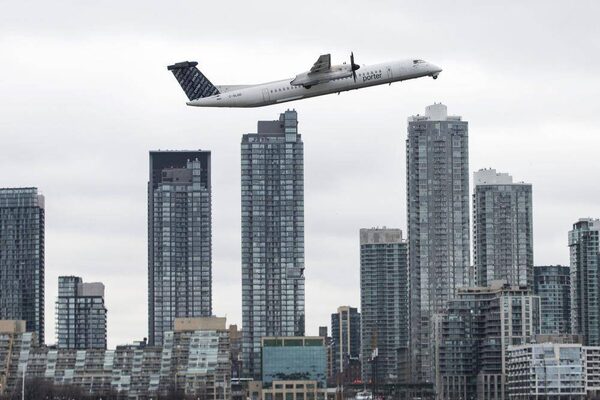 A Porter Airlines plane take off from Toronto's Billy Bishop Airport in front of condo towers on Wednesday April 10, 2013.