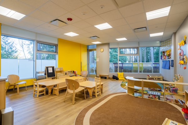 And if one of those little airplanes stumbles on the tarmac, there won’t be any scraped knees. “Our No. 1 focus is always safety, in the architecture and in the way we design things,” says Paul Dean, vice-president of real estate and business development. That means the 7,000 sq. ft. of squishy and wood-chippy playground is protected by locked gates and high fences. Climbing structures for the older children are at the next playground over. Inside the building, the locally made furniture has rounded corners.