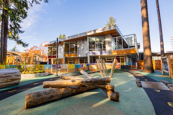 While the tall cedars and Douglas firs on Acadia Road near the University of British Columbia campus have likely stood for hundreds of years, two Douglas firs have become joyfully encircled by colourful, artificial surfacing. Less than two weeks ago, CEFA (Core Education and Fine Arts) Early Learning’s 50th school celebrated its grand opening in a bright 11,900-square-foot building while welcoming the two elderly trees into its adjoining 7,000-sq.-ft. playground.