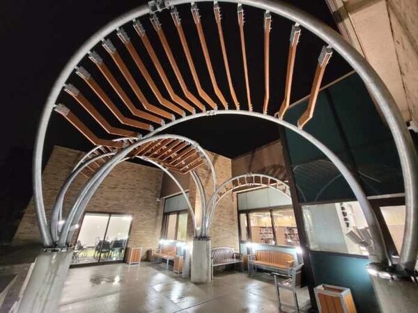 When lit up at night, the Reading Garden creates quite a beacon for Keele Street traffic; this is good, since the library is just one small part of the community centre complex – built in sections from 1970 to the early part of this century – which contains a pool, a bowling alley, bocce ball courts, an ice rink, and squash courts. The Reading Garden won a Vaughan Urban Design Award of Merit in January, 2023.