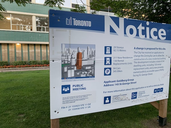 Development notice on the lawn of 145 St. George Street in Toronto.Dave LeBlanc/The Globe and Mail
