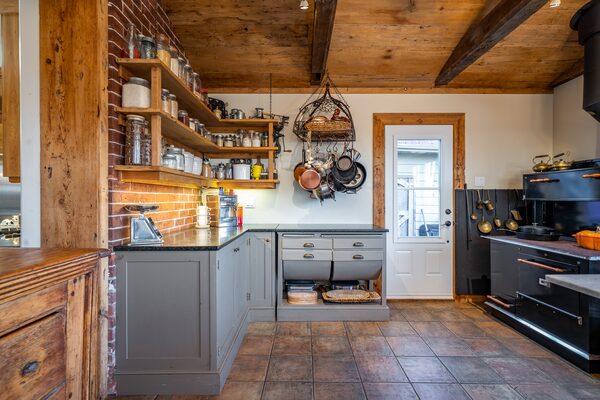The floors in this main house are the original wide-plank hemlock, which is a medium-yellow colour that’s lighter than the mainly oak furnishings. That hardwood continues into the galley kitchen updated with custom cabinets, rustic backsplash, a huge gas range with double oven (below a custom-made reclaimed barnboard vent hood) and an under-counter fridge.