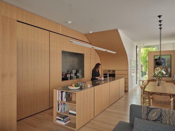 Similar to the Euclid bedroom and roof garden that pleased Mr. Mays so much, in this house, Mr. Goodman can turn a handle and slide a wall of glass aside to reveal a Juliette balcony that gives diners the impression they are seated in the woods. And if it looks as if the dining table and matching bench – designed by architect Omar Gandhi and Mjölk – fits perfectly under the massive sliding doors, that’s because it was planned that way.