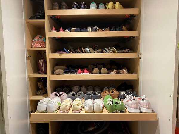 Her husband is allowed to have a shelf, and her son’s shoes still fit inside hers (he has a rotation of about eight multi-coloured shoes on the go at all times) but a place to put all her shoes is the thing she will miss the most about selling the house.