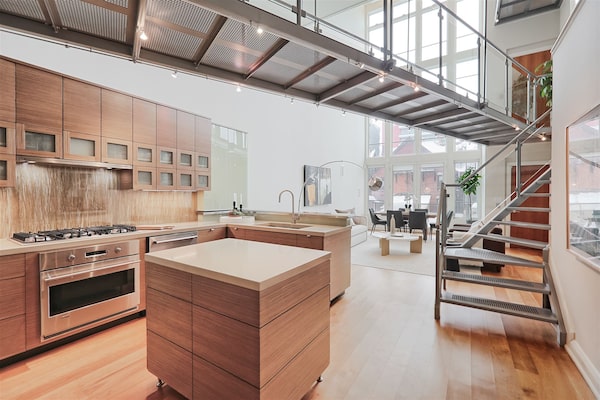 A steel-and-glass-clad catwalk spans the kitchen in the atrium of 90 Madison Ave.Imaginahome Inc.