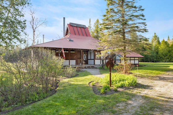 And, indeed, a walkabout of the 1,700-square-foot country house reveals many details that can be classified as either. Approach the house after a winding drive through dense forest and the first thing you might notice (after the striking red roof) are the white-painted panels that make up the walls and resemble shoji screens.