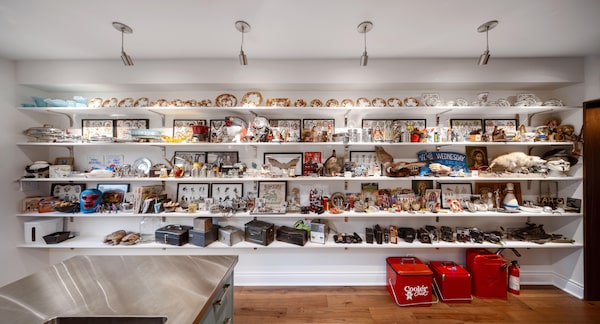 “Threshold-o-rama,” Ms. Ely says as we walk onto that tongue – thankfully not wet and squishy – and into the kitchen, where the first-timer’s jaw will undoubtably drop. And it’s not the carefully curated and contained Aladdin’s cave of taxidermy, old cameras, microscopes, baseballs gloves, Pez dispensers, tikis, flash art, bowling pins, wrestler masks and other tchotchkes that cause all the jaw-dropping, either. Impossibly, Ms. Ely has crafted a kitchen that not only competes with this kaleidoscope (or maybe collide-o-scope?) of kitsch, but complements it as well.