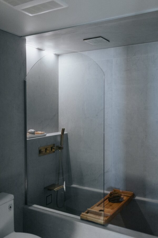 The primary bathroom is all Ms. Onile, according to Ms. Bryk. It’s entirely done in oversized slabs of porcelain in a light grey colour that evoke concrete. Condo bathrooms usually come with no natural light and can be tough to style, but Ms. Onile was a veteran traveller and had been inspired by the baths in Morocco. More famous are the elaborate tilework of the hammams, but there are simpler baths that are just smooth vaults of concrete with slab benches that are indirectly lit, and that’s what Ms. Onile’s bath evokes. To add warmth to the soft grey space she used gold acrylic sheet for the mirror, a subtle touch that is sure to bring a glow of health to any face that uses it.
