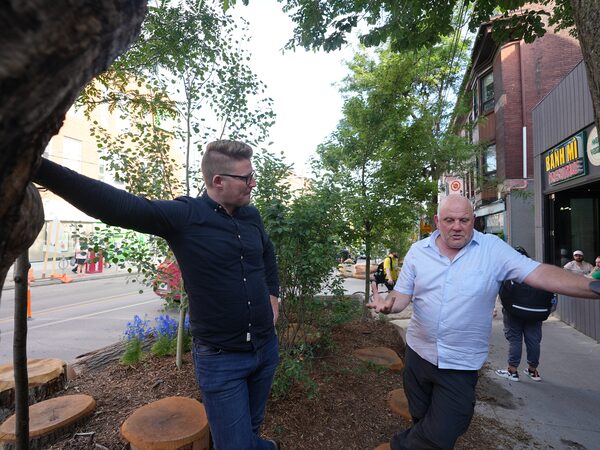 He mentions the owner of the popular Jet Fuel Coffee, who, during COVID, was forced to conduct his business from a slot in his façade (and removed the wooden boards only as the green installation was being trucked in a few weeks ago) and, two doors over, the Canadian Contemporary Dance Theatre. Both were apprehensive due to parking and loading concerns, but both have come around because of how different the neighbourhood feels. “Everybody had their head down … it was just frenetic on the sidewalks,” he was told, “and now I’ve had more conversations in the last week than I’ve had in the last three years.”