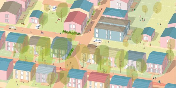 Renderings of the 'subdivillage' by Smart Density. The concept was one of six winners of the Ontario Association of Architects SHIFT 2025 Challenge, Reshaping Communities, that asked firms to reimagine the built environment and address challenges like climate change, housing, and social shifts.Smart Density