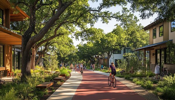 Green streets are where things get interesting. No automobiles allowed, only emergency vehicles. Here, walkers, cyclists and front-yard gardeners are king and queen. But unlike “recreational trails, these are actual streets lined by houses” with “passive surveillance” to “ensure safety at all hours of the day.”