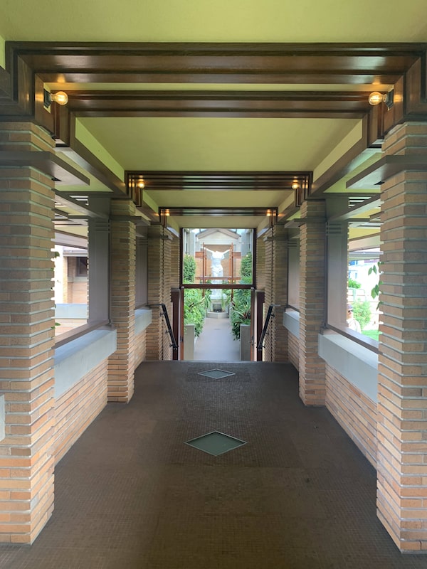 After showing us the vertically stacked encyclopedias (FLW liked how they mimic his long bricks), our docent took us out on the veranda – really an outdoor room – to show us the half-circle “floricycle” that FLW created so something was always blooming for Darwin and Isabelle.