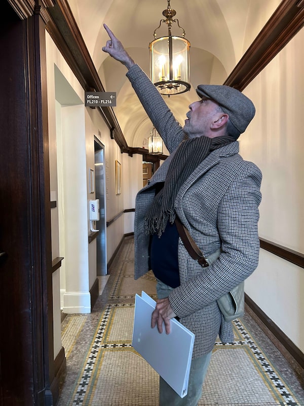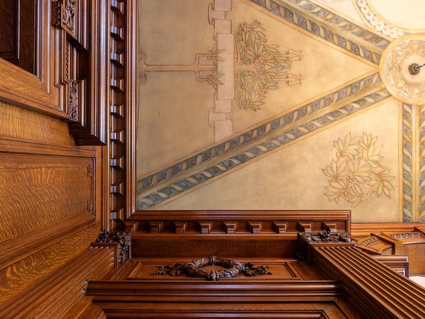 Once I can pry my eyes away from the intense beauty of the “Jacobian-inspired” carved oak and sandstone fireplace, Mr. Winterton suggests I look up at the ceiling by German-Canadian art nouveau painter Gustav Hahn. It’s breathtaking. We peek into the former music room and then study some of the simpler woodwork in the hallway, which sports Mr. Darling-specific motifs. “This is a period of architecture where every space was considered,” says Mr. Winterton. “This form, with the little legs, this kind of keystone form, was used a lot by the Edwardian architects, but for Darling in particular, this is his signature.”