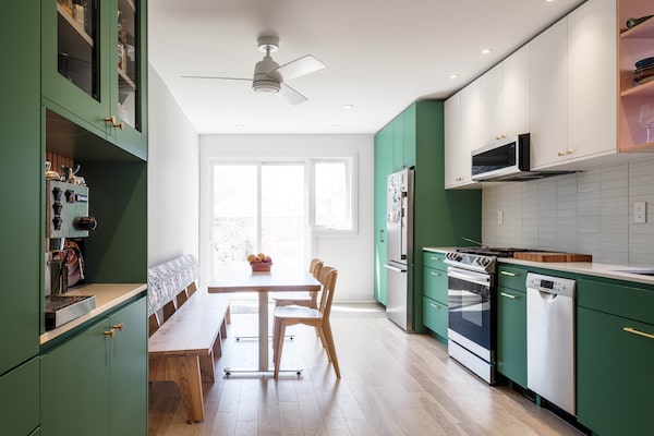 Not to be outdone by wallpaper, the kitchen announces itself with a bank of teal cabinets, complete with an espresso station, that leads to a wonderful, custom bench and informal dining table. By upholstering the backrest and not the seat, family members can “slide in pretty quickly,” says Mr. Martin. While seated here, one can consider the outside world via the new sliding door to the backyard, or a window tucked behind a set of shelves.