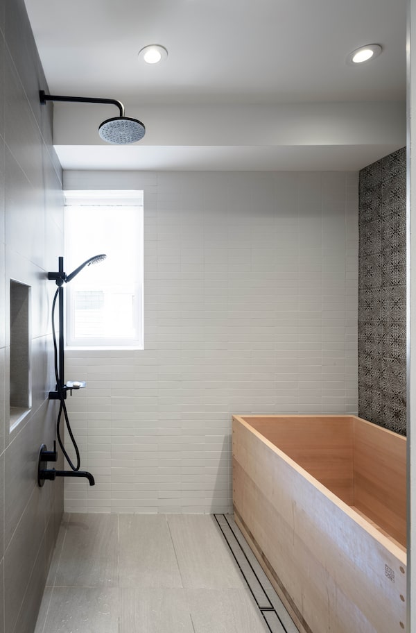 The imported wooden tub has a dedicated faucet and a linear drain to catch overflow. On the opposite wall is a conventional shower and a low faucet for filling a wash bucket.Rémi Carreiro/Remi Carreiro