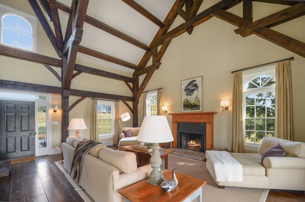 The home’s position on a rise provides views over a small lake where a resident osprey dives for fish and herons wade in summer.