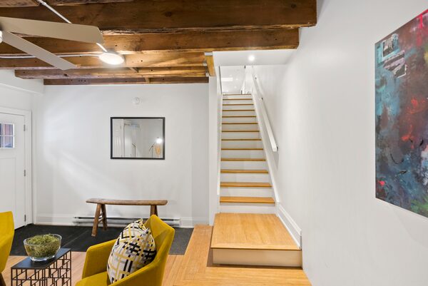 The architects divided the existing building into two suites with separate entrances. They bulked up the insulation and sound proofing throughout the building and repurposed materials when they could.