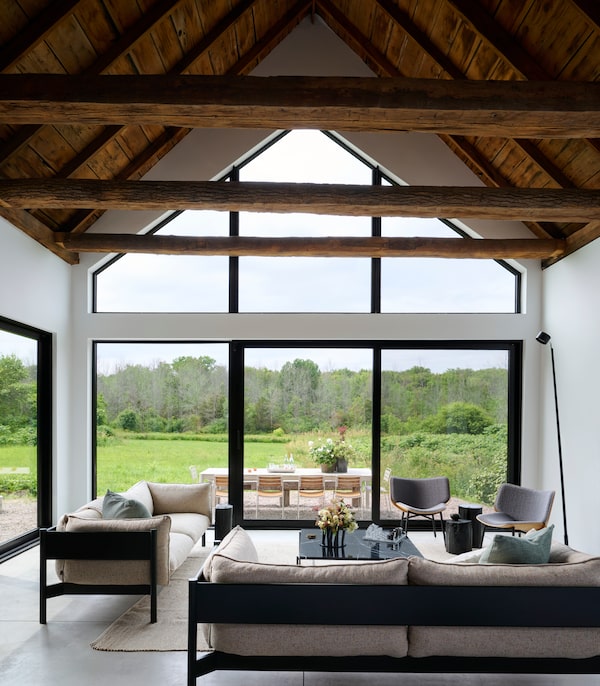 To be clear, Ms. Emam did not remove the second floor of the original house, but rather in the unadorned, attached building. So, where once there was hay storage, there is now a glorious volume of light and air punctuated by those original beams, now raised up (but still structural) to offer ample headroom. An impossibly long window divides the part of the kitchen backsplash that highlights a jumble of scrap brick suspended in old, pebble-infused concrete – an original wall never meant to be seen but now made beautiful by the juxtaposition of sexy Scavolini cabinets, polished concrete floors and the smooth drywall of the family-room area. And that family-room drywall, it should be noted, marks the portion of the attached building that was more of a screened-in, open-to-the-elements area.