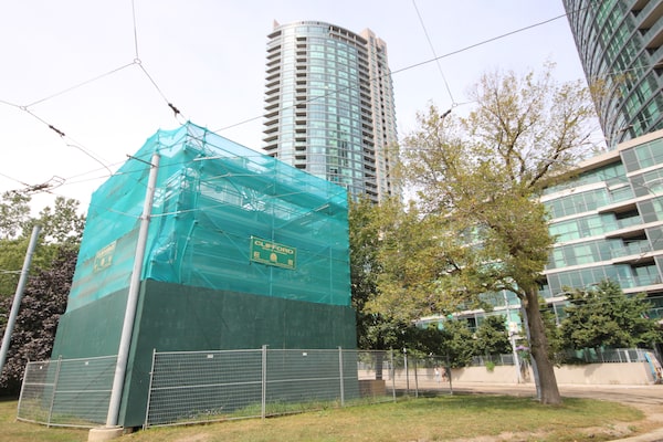 the Queen’s Wharf Lighthouse, Designed by Kivas Tully and erected in 1861, is enshrouded by plywood and green netting as it undergoes restoration.Dave LeBlanc/The Globe and Mail