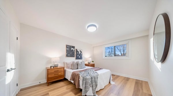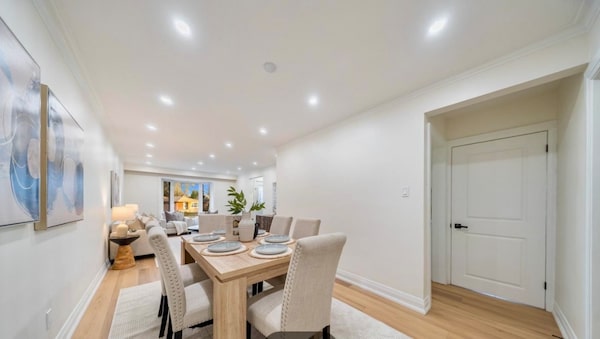 The main floor has three bedrooms and one bathroom, as well as open-concept living and dining areas with pot lights.