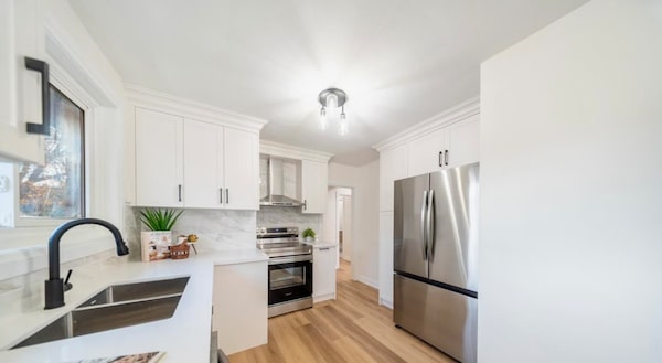 The kitchen was refinished with new cabinetry, quartz countertops and stainless-steel appliances.