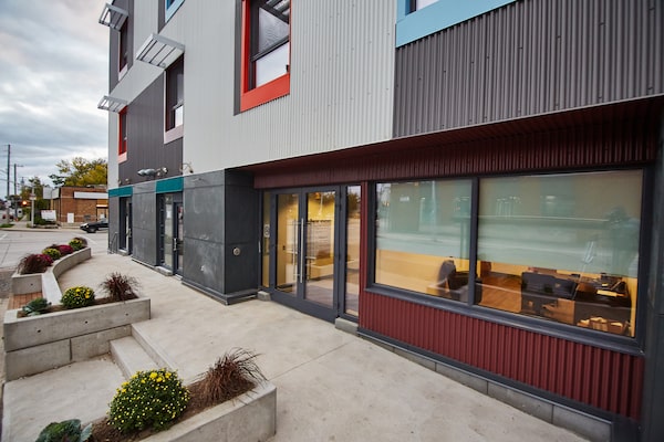 Parkdale Landing, a three-storey apartment at 205 Melvin Ave, Hamilton, Ont., that opened in 2018 with 57 studio and one-bedroom apartments.Invizij Architects