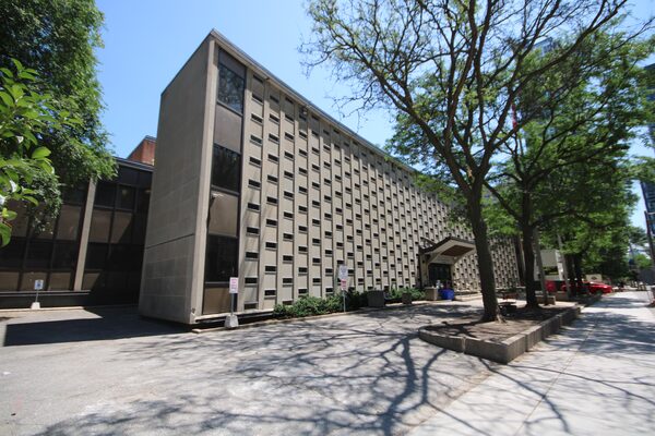 The Ontario Court of Justice building on Toronto's Jarvis Street designed by Peter Dickinson in 1954. The building’s checkerboard front of 411 tiny windows on a concave, Queenston limestone wall never fails to impress on architectural walking tours.