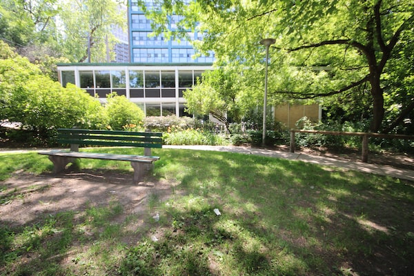 There are six storeys on the busy Donway, and then, after some parking and verdant space, a second building of four storeys behind relates to those single-family houses. Both buildings are crisp, geometric and exquisitely detailed: banded windows are flush with the buff brick façade; the black I-beams are set into the façade so as not to take centre stage; slim balcony floors are minimalist and elegant. Inside, there is a wall of ultramarine Bisazza tile, a floating planter-box across the big window, and a shoji screen-type divider that separates tenant mailboxes from the room. It is, however, a private property.