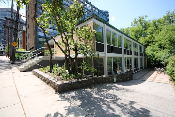 Going beyond its one-storey entrance, the two-storey building overlooks Toronto's Lawren Harris Park.