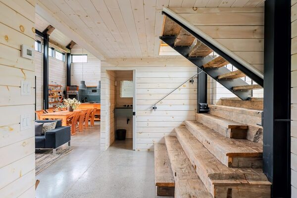 Reclaimed wood from a barn down the road was used for the rustic treads of a staircase to the upper level.Daniel Vaughan