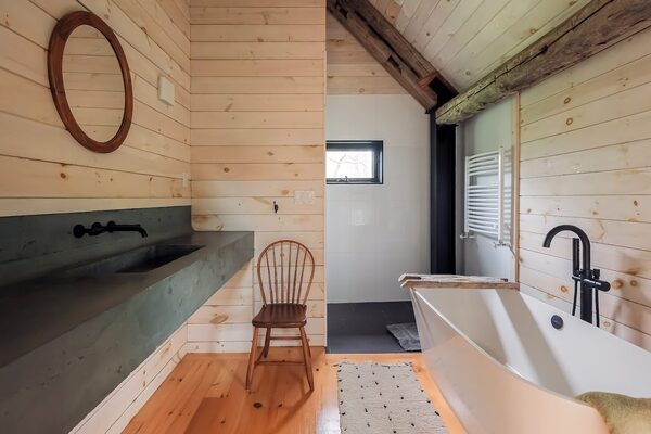 Ms. Taylor brought her design sense to the interior, he adds. Walls are clad in white pine, the sinks and counters are fashioned from poured concrete and there’s a deep stand-alone tub in the bathroom.