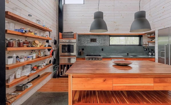 Local cherry wood was used to build cabinets, open shelves and a large island in the kitchen.Daniel Vaughan