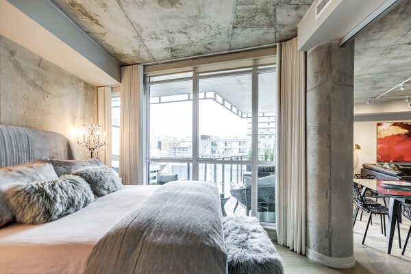This 1,087-square-foot suite was built in 2013 with nine-foot concrete ceilings, full-height windows and an L-shaped balcony outside the primary bedroom and principal room.