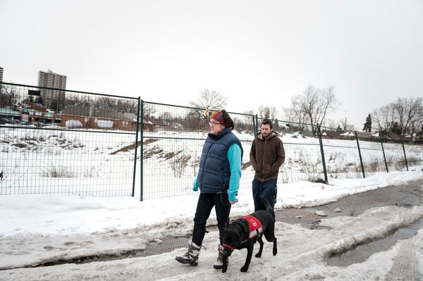 Sandra Ania, Tim Sullivan and their dog Hana walk alongside an empty lot where a condo they bought was supposed to be located on March 3, 2019.Christopher Katsarov/The Globe and Mail