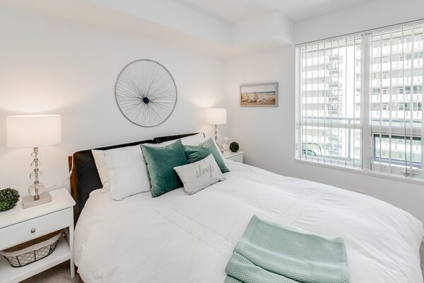 This roughly 10-year-old suite was given about 750 square feet of living space, encompassing two bedrooms and an open living and dining area with windows on two sides and sliding balcony doors.