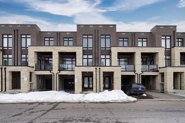 In a fairly new townhouse community, this three-storey unit displays a modern brick-and-stone façade with a built-in garage out front and a semi-private yard at the rear.