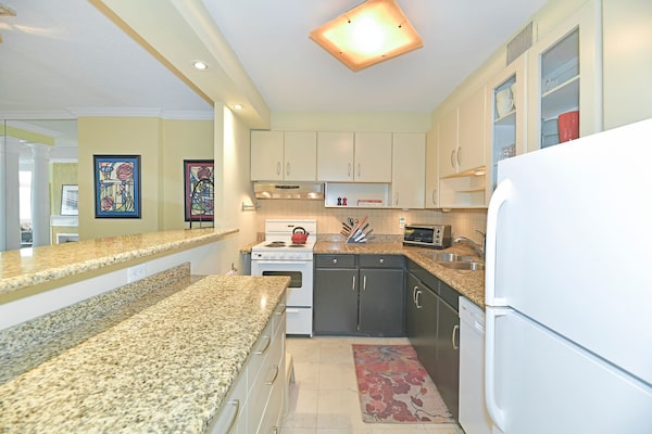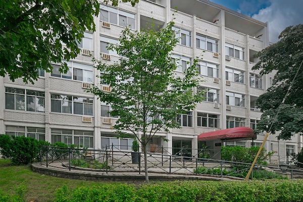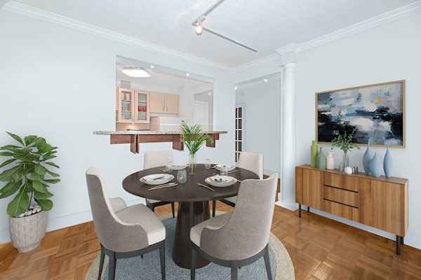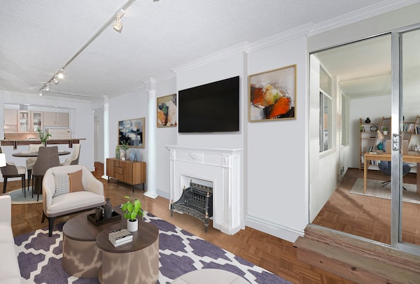 This more than 700-square-foot unit has a traditional layout with a separate kitchen and dining area, as well as a solarium and a living room with an antique fireplace mantle.