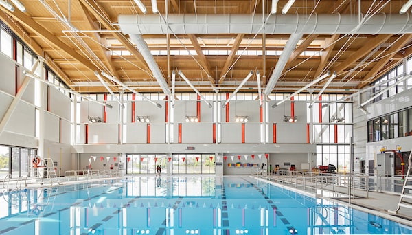 “What we’re striving to do is to create nooks and eddies off of the main stream where people can feel comfortable to watch their children in swimming … or to gather before going in for afterschool basketball,” says architect Phil Fenech, the project leader. “So it’s the gathering spaces alongside the program spaces that give you that sense of intimacy.”