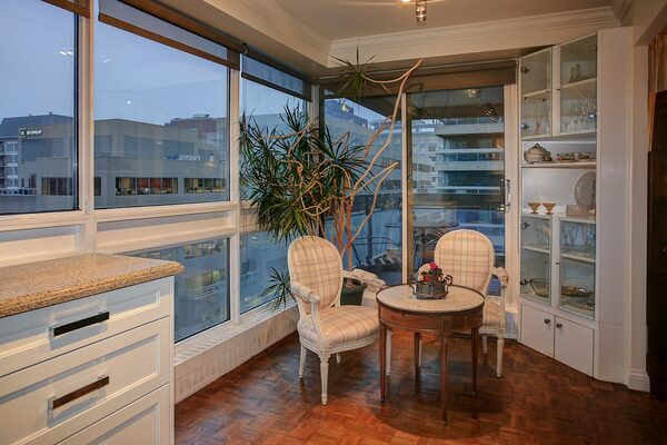 This 1,312-square-foot unit has a traditional design with floor-to-ceiling windows in each room. Sliding doors open to a wide balcony from the living room and updated eat-in kitchen. The suite’s two bathrooms have also been recently remodelled.