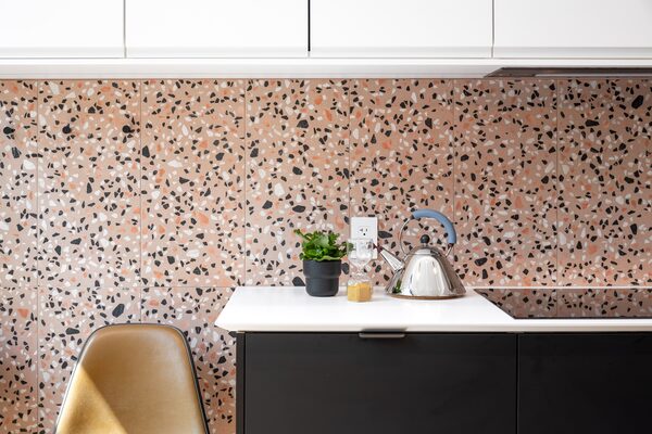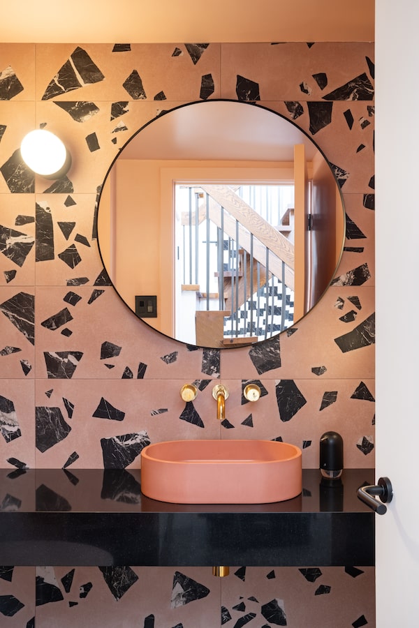 To add some levity, the main-floor powder room and the completely redesigned kitchen both feature tiles with overscaled terrazzo in salmon and greys; in the powder room, the aggregate pieces are so large that it’s like one is looking at a terrazzo floor through a microscope.