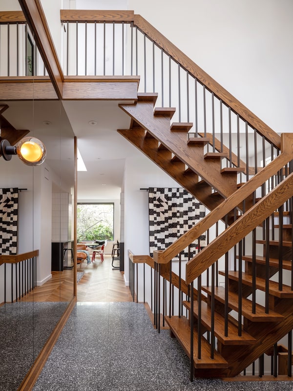 Straight ahead is the swoon-worthy, Brady Bunch-esque staircase, set perpendicular to the wall rather than parallel for full sculptural effect. “Some of the neighbours that I’ve seen have updated and modernized it,” says Mr. Kuchinsky, adding that he might not have purchased the house had that been the case. The stair also, says Ms. Denegri, “functions in creating that pivotal point” where all of the volumes in the house – double-height foyer, stairs to basement, living room with skylight – all connect. That pivot makes it easy for the family – the Kuchinskys have two young children – to communicate from upstairs bedroom to main floor, or from main floor to Mr. Kuchinsky’s design studio in the basement.