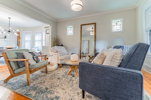This 110-year-old house has original oak flooring, pocket doors, stained glass windows and formal living and dining rooms.