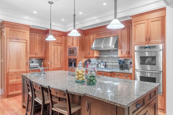 The kitchen built of cherry wood is another nod to Pasadena style, the architect says.360hometours.ca