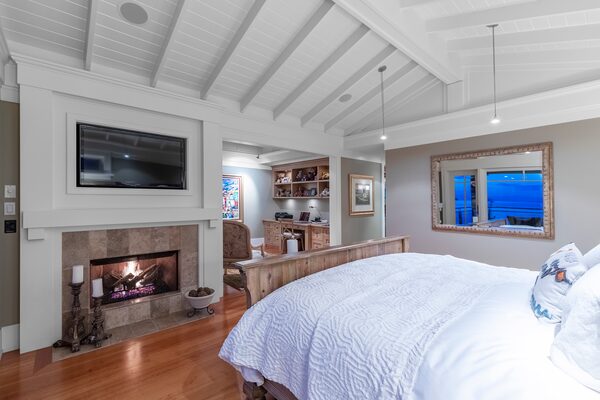 The master bedroom on the upper level has a cathedral ceiling, a fireplace and doors opening to a covered balcony.360hometours.ca
