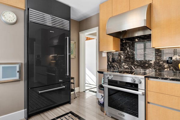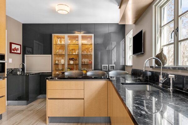 The kitchen has been entirely redone with blonde wood cabinets (with some high, narrow uppers), a basket-weave-patterned tile floor and dark stone countertops. At the edges of the counter runs are some open rounded shelves that borrow art-moderne flourishes, so too does the sweeping curve of the stove hood. An L-shaped peninsula creates a breakfast bar behind which is a floor-to-ceiling glass display cabinet filled with vintage crystal and china. There’s more pantry storage beside.